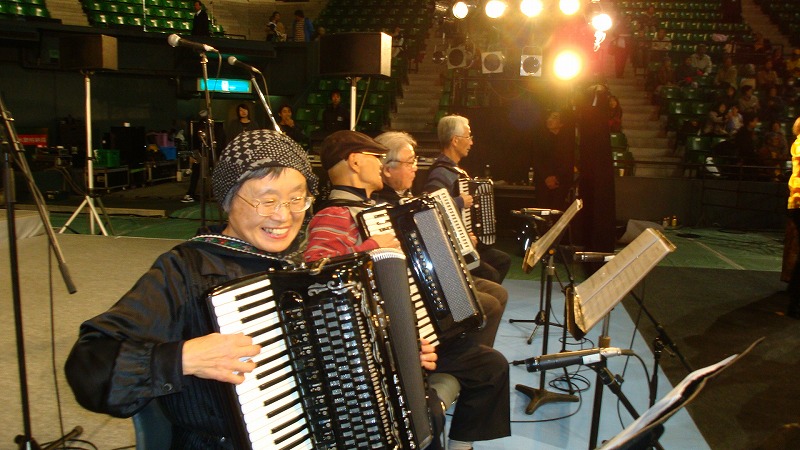 伴奏陣・アコグル〜プ四人が笑顔で弾いています。